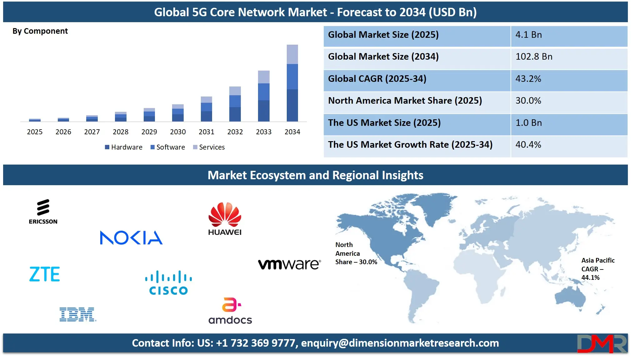 The Global 5G Core Network Market size is projected to reach USD 4.1 billion in 2025 and grow at a compound annual growth rate of 43.2% to reach a value of USD 102.8 billion in 2034.