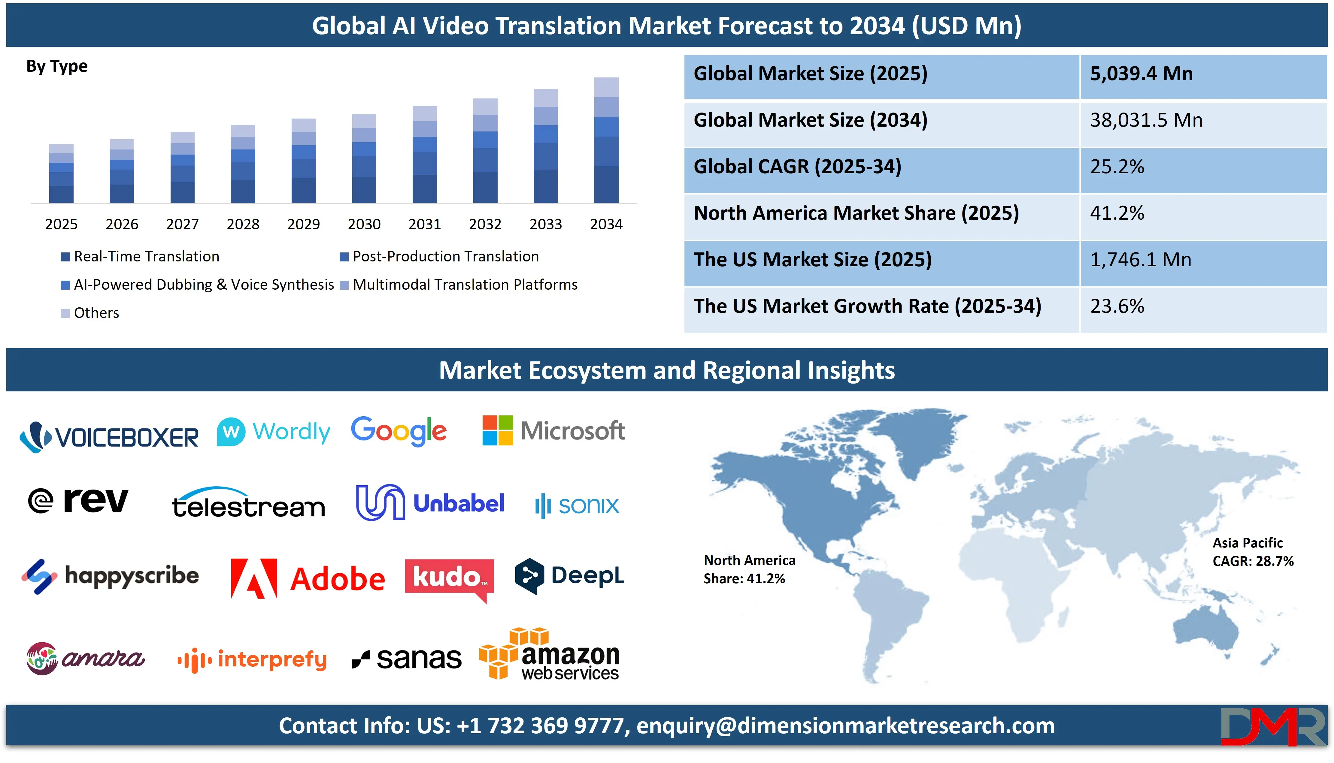 The Global AI Video Translation Market is projected to reach USD 5,039.4 million in 2025 and is expected to grow at a CAGR of 25.2% from 2025 to 2034, attaining a value of USD 38,031.5 million by 2034. The market's explosive growth is driven by the escalating demand for globalized content, the rise of streaming platforms, and the increasing consumption of video media across diverse linguistic regions.