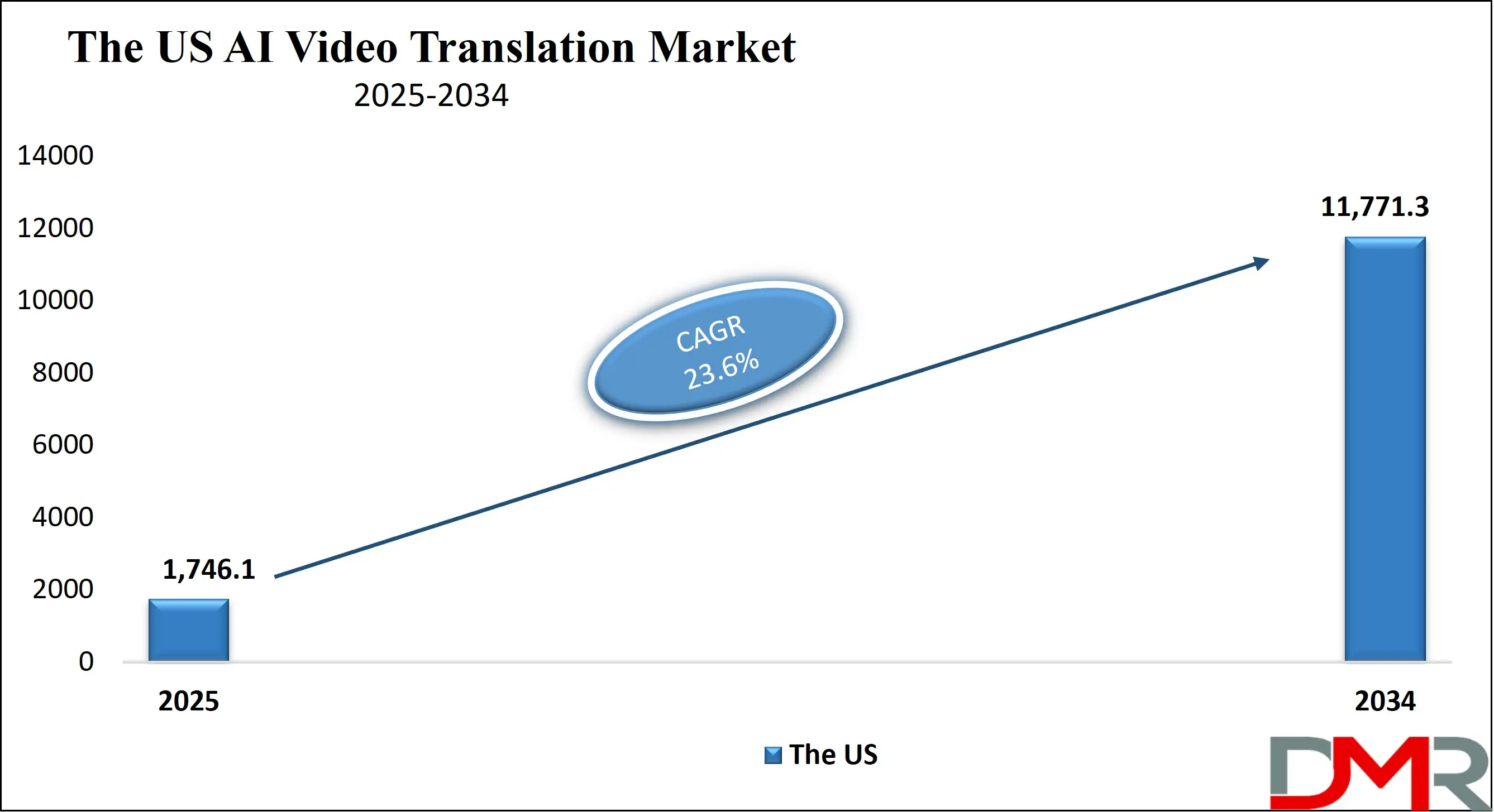 The U.S. AI Video Translation Market is projected to reach USD 1,746.1 million in 2025 and grow at a CAGR of 23.6%, reaching USD 11,771.3 million by 2034. The U.S. leads global adoption due to its dominant media and entertainment industry, high concentration of streaming services, and widespread corporate adoption of digital communication tools.