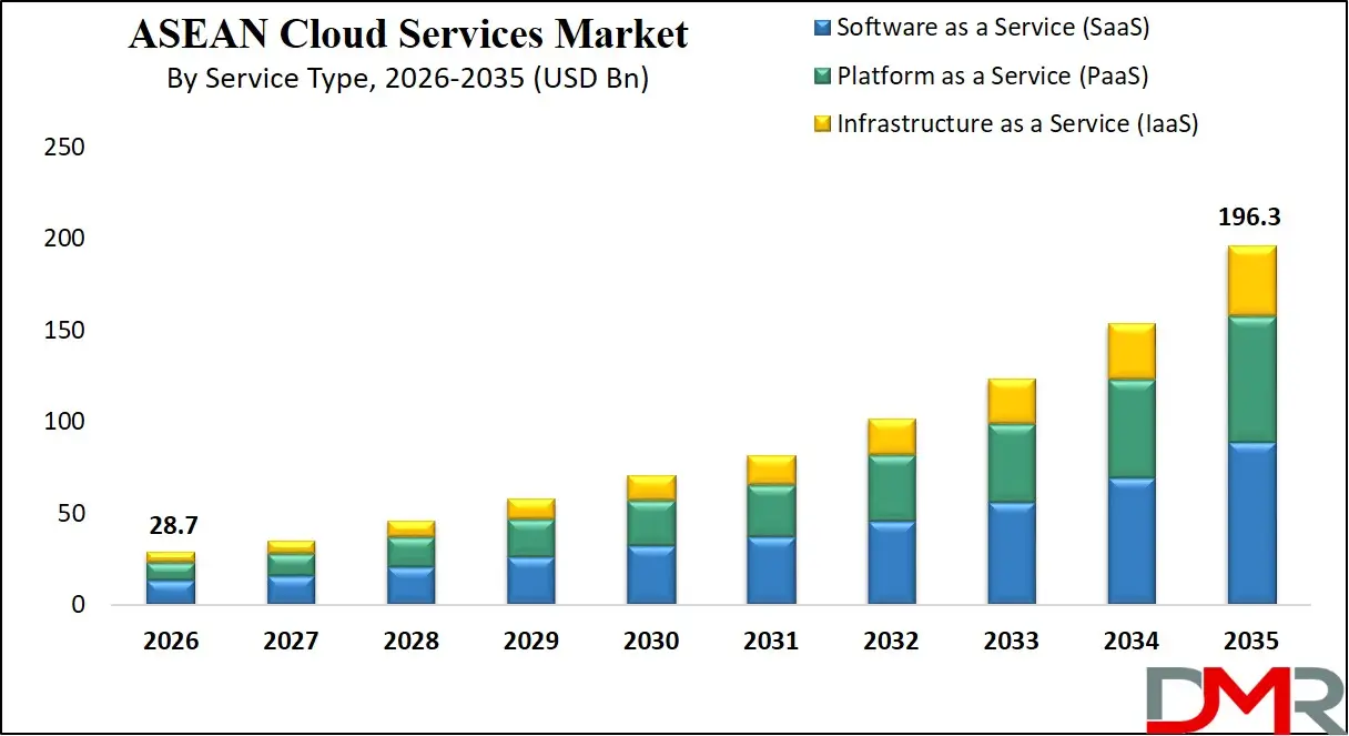 ▾ The ASEAN Cloud Services Market size is estimated to have a value of USD 28.7 billion in 2026 and is expected to reach USD 196.3 billion by the end of 2035.