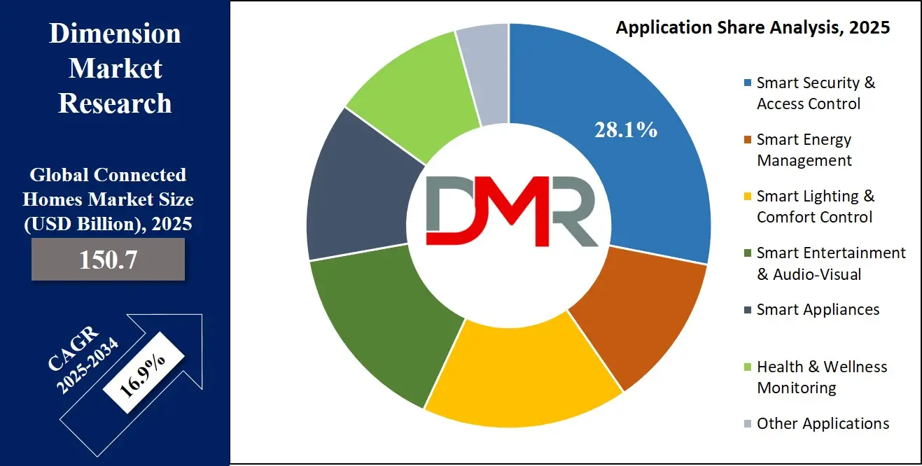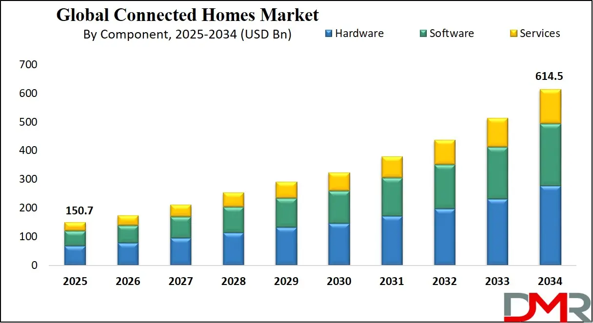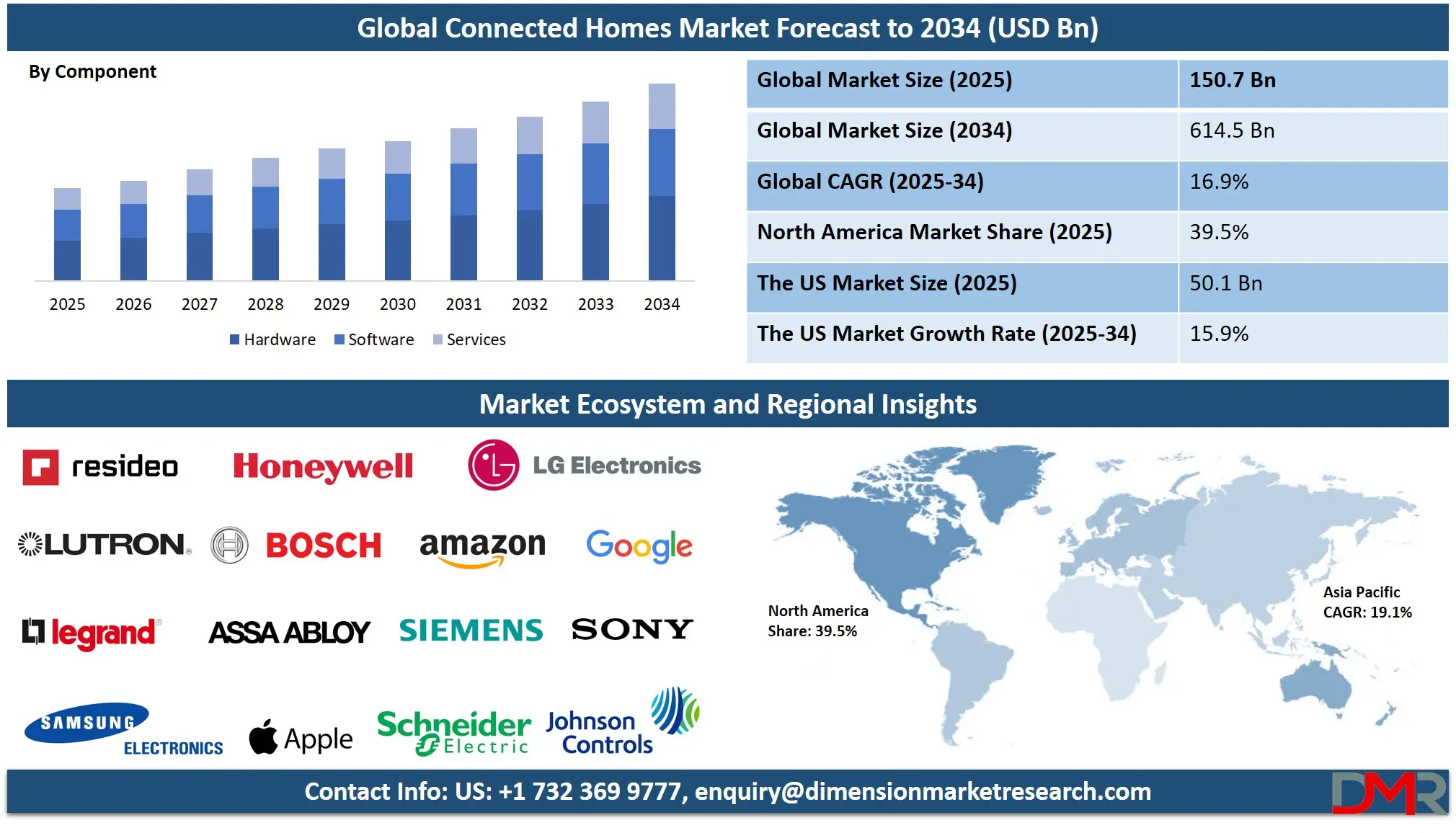 • Global Market Size Insights: The Global Connected Homes Market size is estimated to have a value of USD 150.7 billion in 2025 and is expected to reach USD 614.5 billion by the end of 2034.