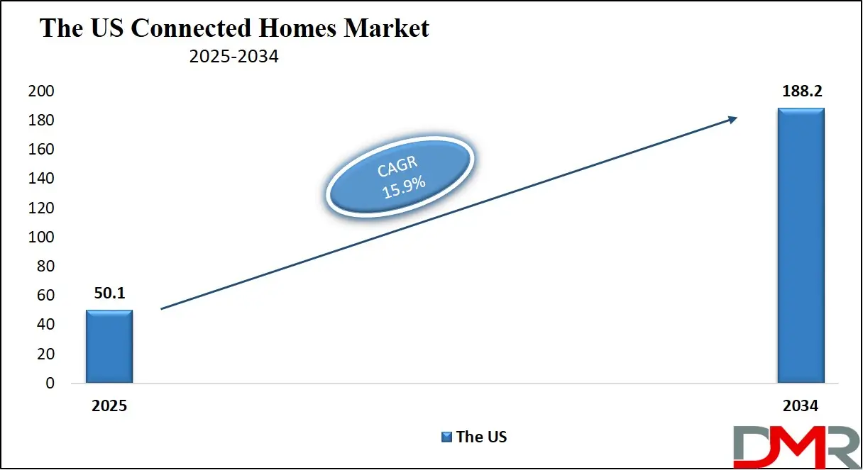 • The US Market Size Insights: The US Connected Homes Market is projected to be valued at USD 50.1 billion in 2025. It is expected to witness subsequent growth in the upcoming period as it holds USD 188.2 billion in 2034 at a CAGR of 15.9%.