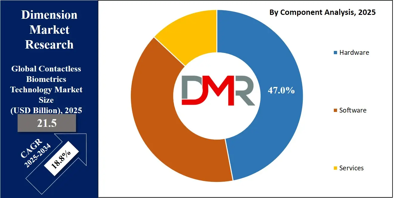In the contactless biometrics technology market, hardware components are expected to hold the largest share of the component segment, accounting for approximately 47.0% of the total market in 2025. This dominance is primarily due to the widespread deployment of biometric sensors, cameras, scanners, and other physical devices that are essential for capturing biometric data such as facial features, iris patterns, or palm vein structures.