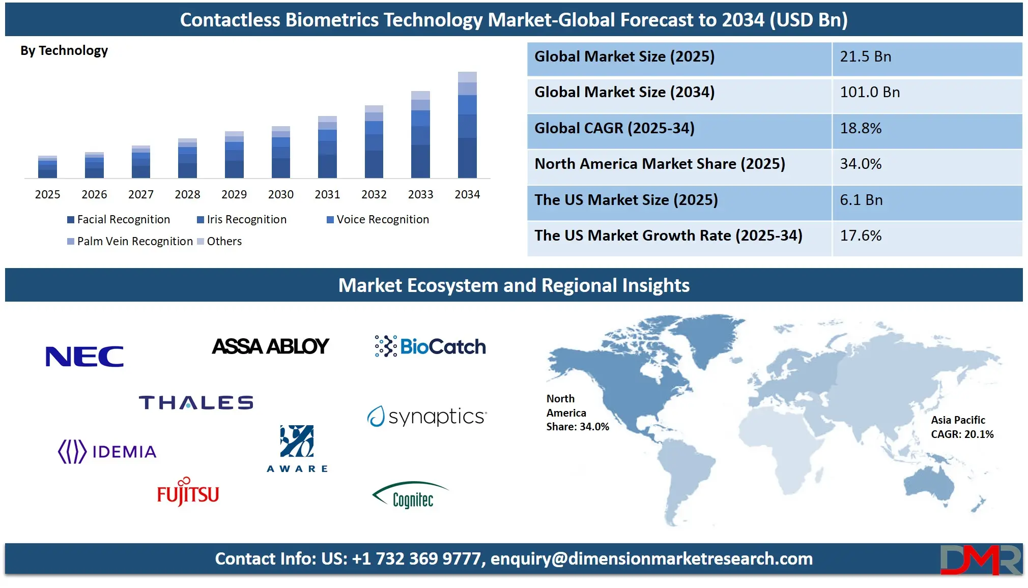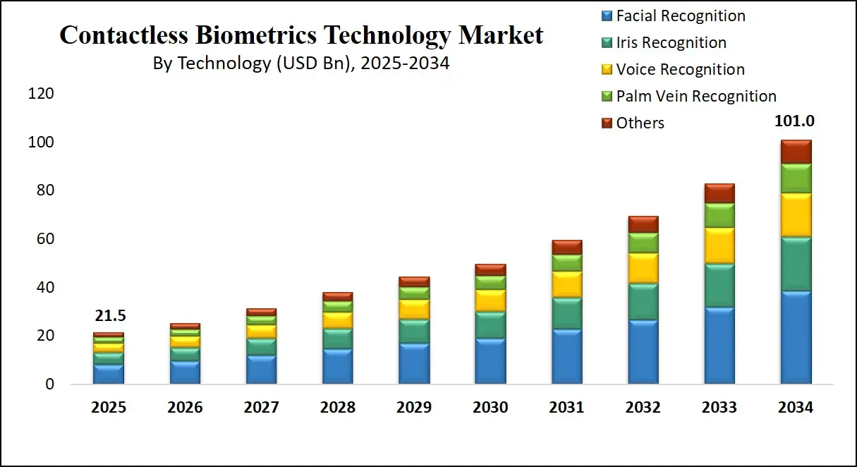 - Market Value: The global contactless biometrics technology market size is expected to reach a value of USD 101.0 billion by 2034 from a base value of USD 21.5 billion in 2025 at a CAGR of 18.8%.