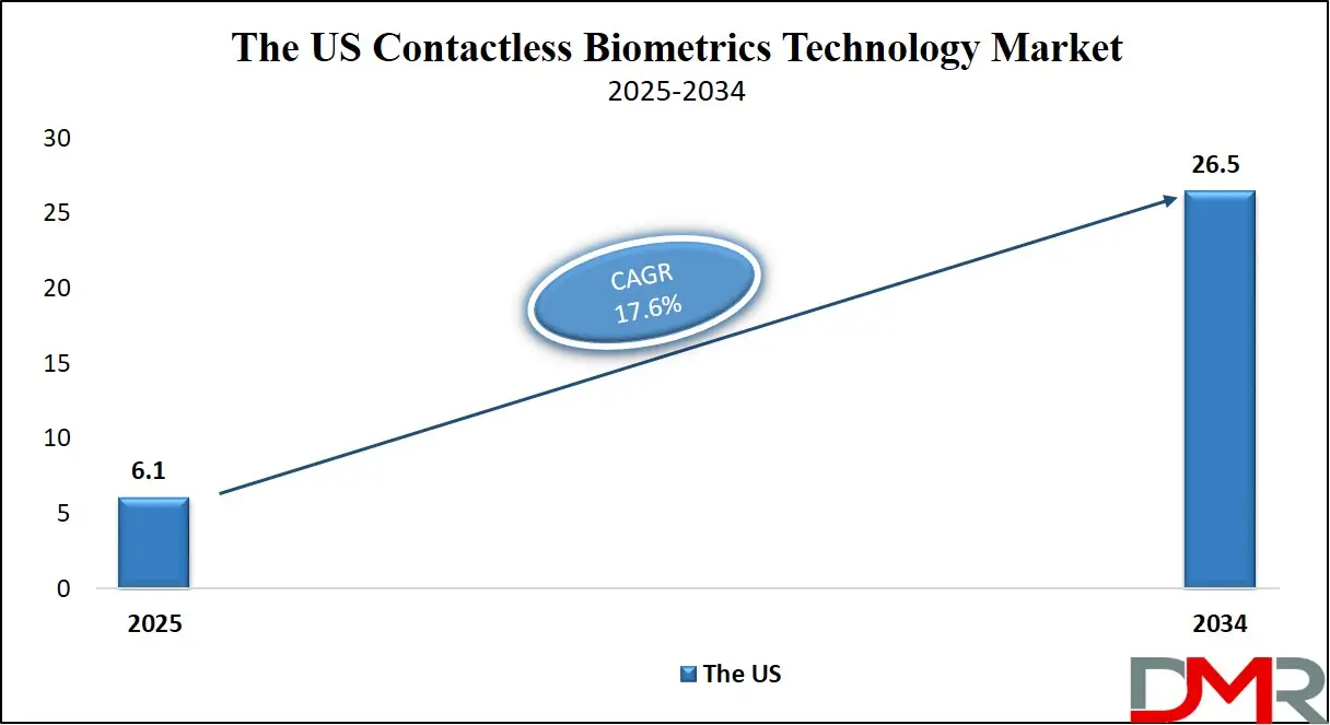The US contactless biometrics technology market is projected to be valued at USD 6.1 billion in 2025. It is expected to witness subsequent growth in the upcoming period as it holds USD 26.5 billion in 2034 at a CAGR of 17.6%.