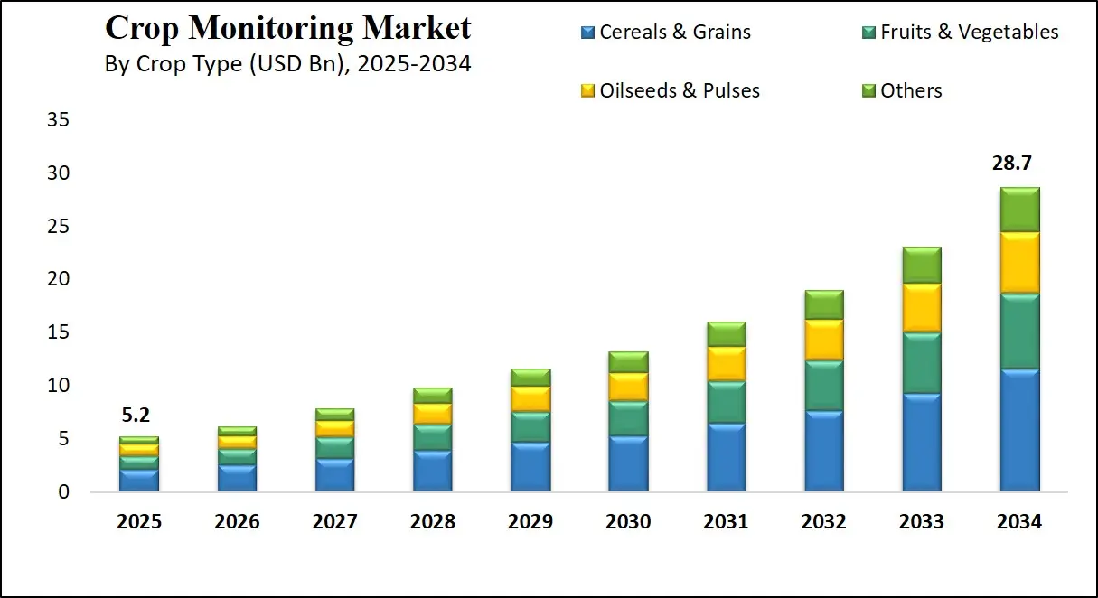 The Global Crop Monitoring Market is projected to reach USD 5.2 billion by 2025 and grow at a robust CAGR of 20.8%, hitting USD 28.7 billion by 2034. This growth is driven by the rising adoption of precision agriculture, remote sensing technologies, IoT-enabled farm solutions, and AI-driven crop analytics. Increasing demand for sustainable farming, yield optimization, and real-time field monitoring are key factors fueling market expansion.