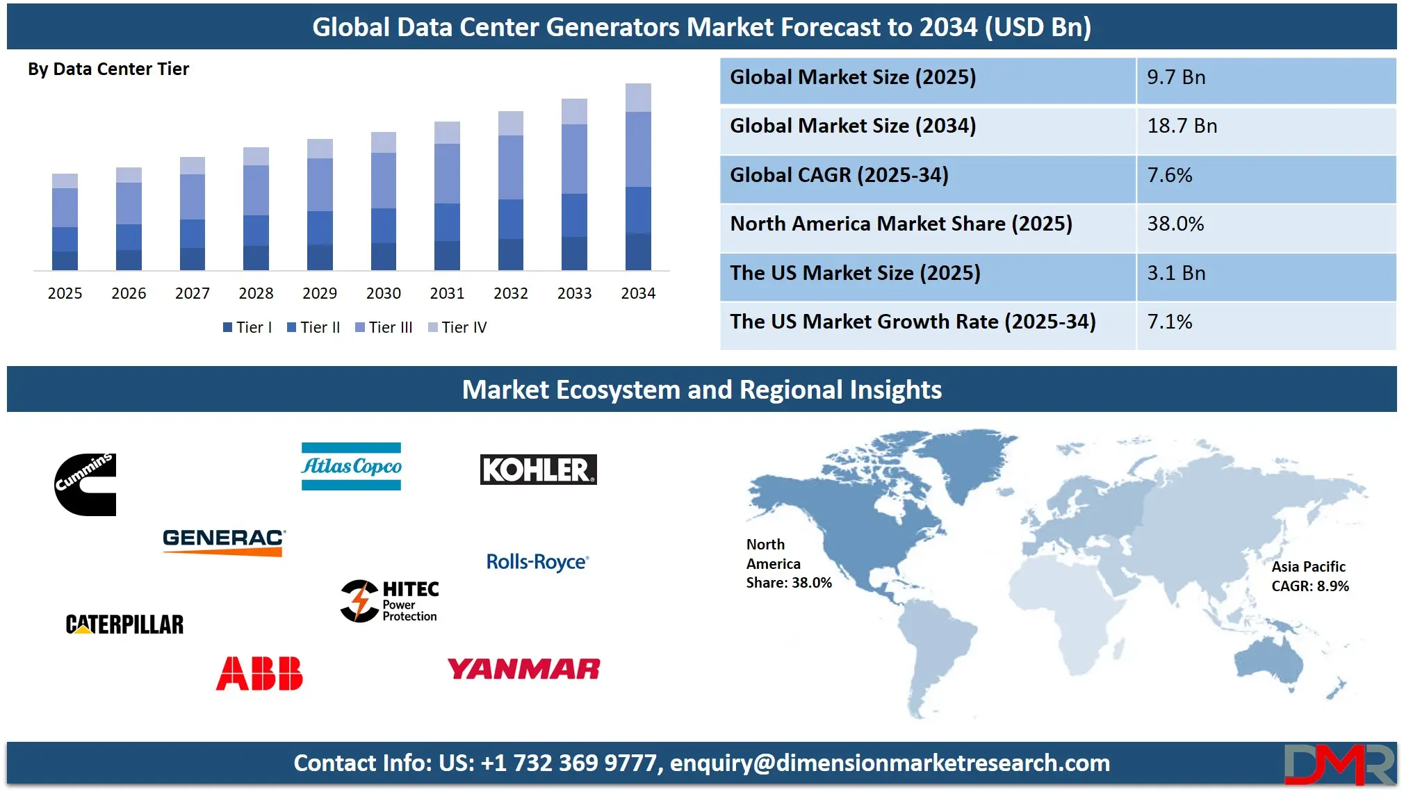 The global data center generators market was valued at USD 9.7 billion in 2025 and is projected to reach USD 18.7 billion by 2034, growing at a compound annual growth rate of 7.6%, driven by increasing demand for reliable backup power, cloud infrastructure expansion, and energy-efficient data center solutions.
