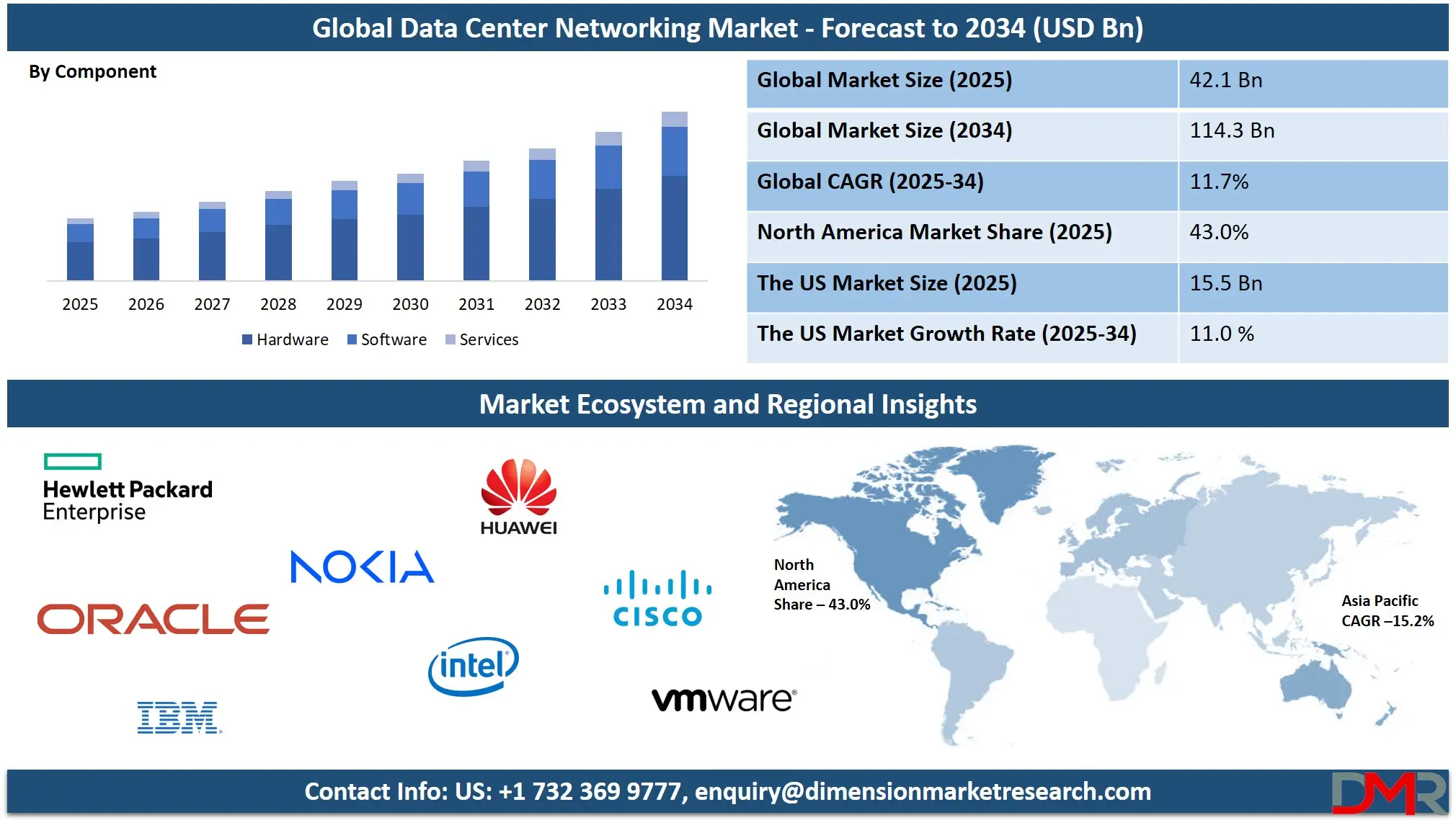 The Global Data Center Networking Market size is expected to reach a value of USD 42.1 billion in 2025 and is expected to reach USD 114.3 billion by the end of 2034.