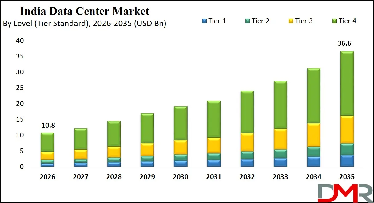 ▾ The India Data Center Market size is estimated to have a value of USD 10.8 billion in 2026 and is expected to reach USD 36.6 billion by the end of 2035.