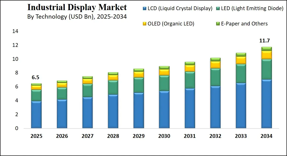 The global industrial display market size is estimated to have a value of USD 6.5 billion in 2025 and is expected to reach USD 11.7 billion by the end of 2034.