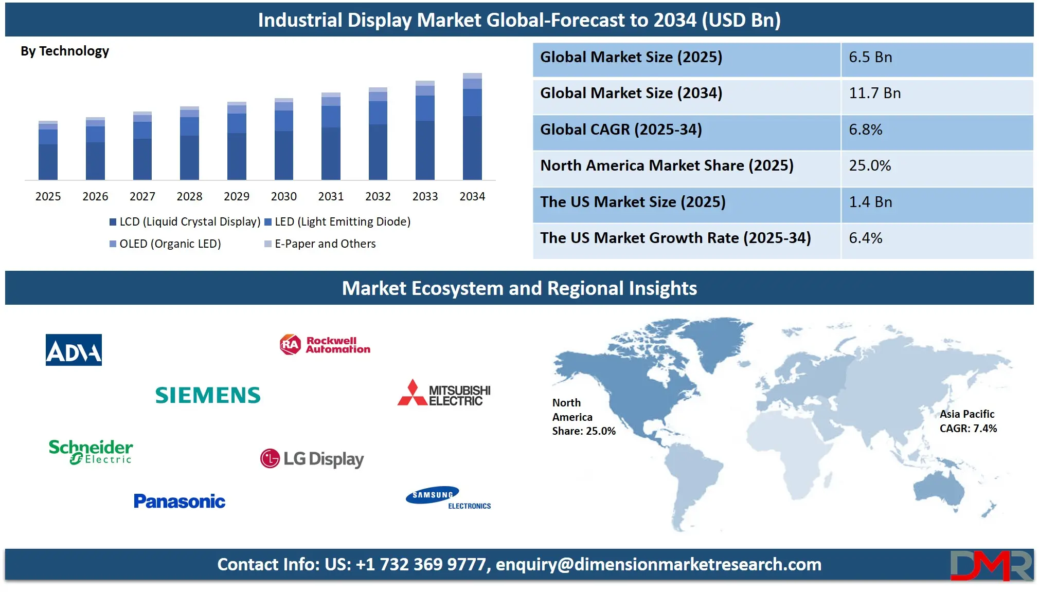 The global industrial display market is projected to grow from USD 6.5 billion in 2025 to USD 11.7 billion by 2034, registering a CAGR of 6.8%. This growth is driven by rising demand for rugged displays, HMI panels, and smart visualization systems across manufacturing, energy, transportation, and automation sectors.