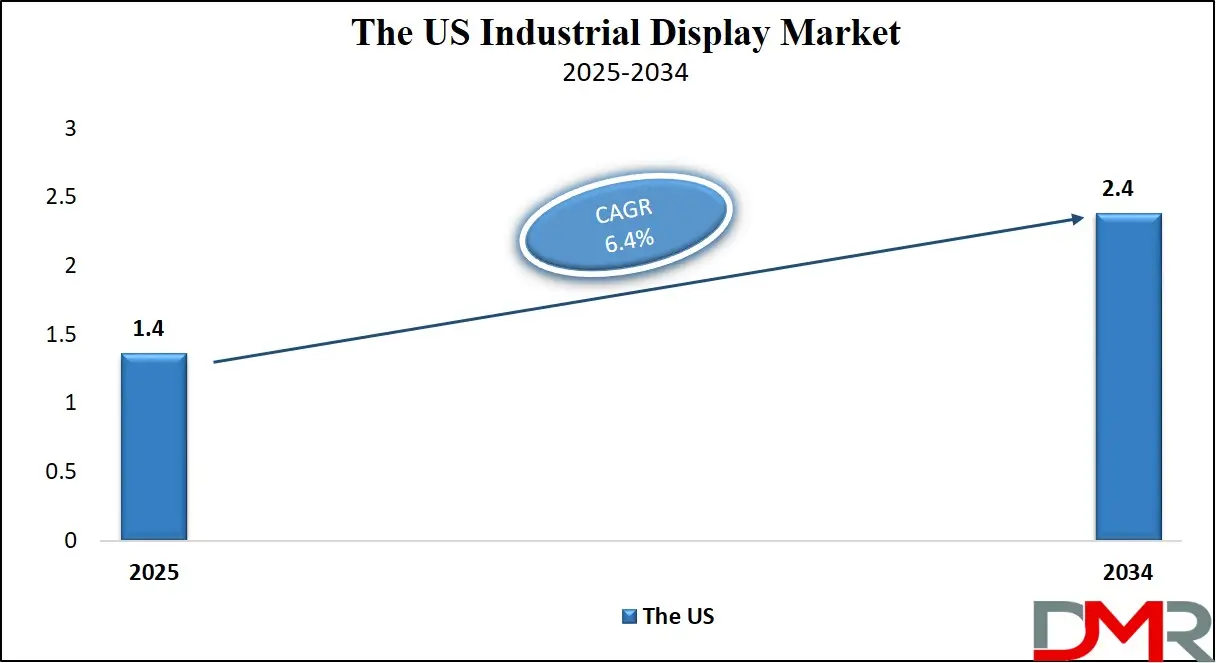 The U.S. Industrial Display Market size is projected to be valued at USD 1.4 billion in 2025. It is further expected to witness subsequent growth in the upcoming period, holding USD 2.4 billion in 2034 at a CAGR of 6.4%.