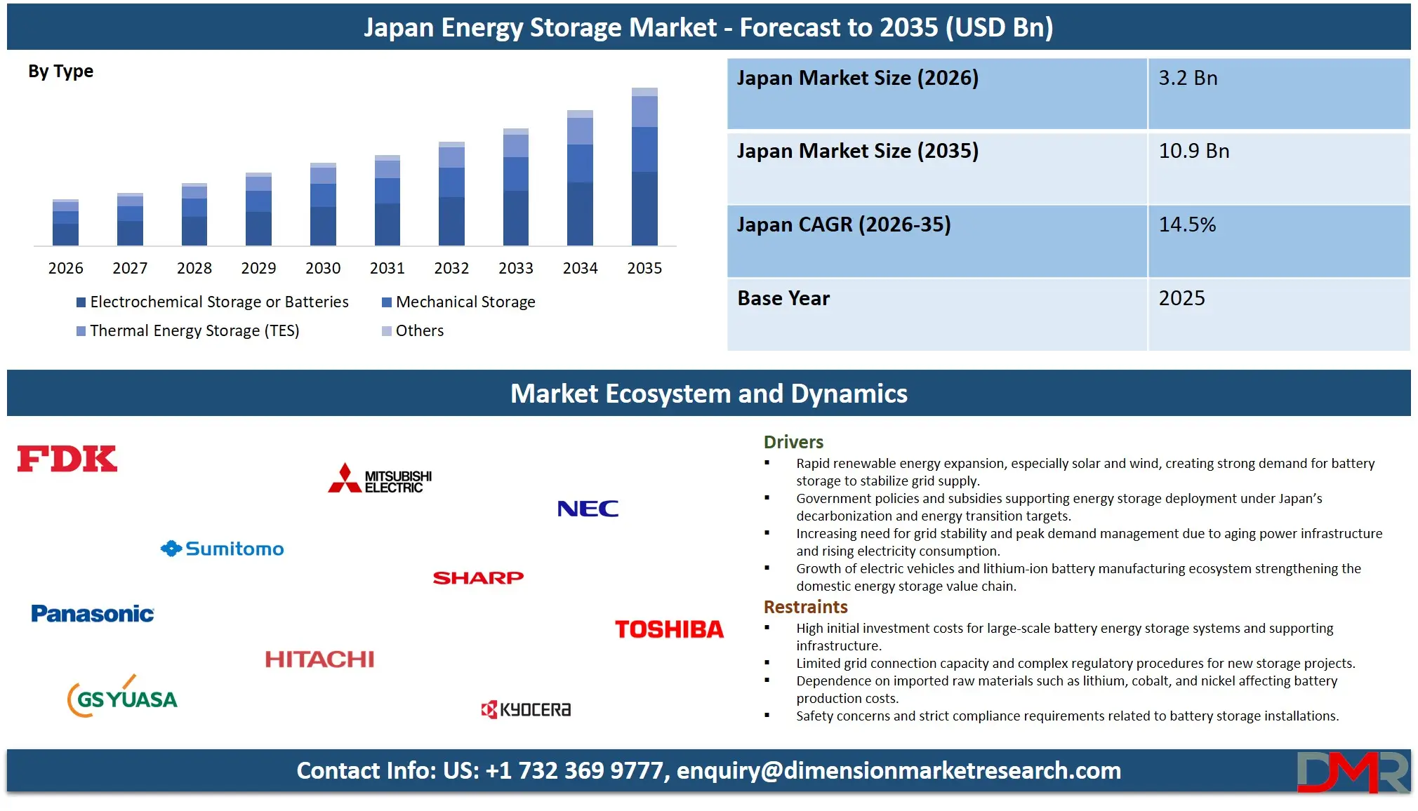 The Japan Energy Storage Market size is projected to reach USD 3.2 billion in 2026 and grow at a compound annual growth rate of 14.5% to reach a value of USD 10.9 billion in 2035.