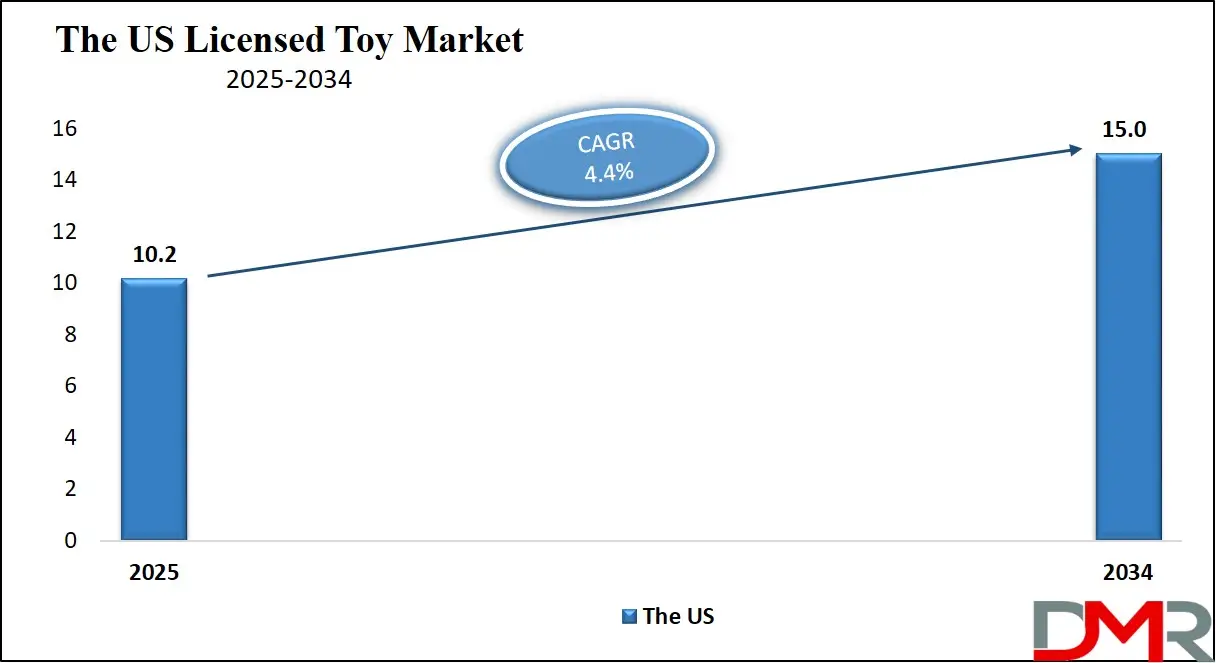▾ The US Licensed Toy market was valued at USD 10.2 billion in 2025. It is expected to witness subsequent growth in the upcoming period as it holds USD 15.0 billion in 2034 at a CAGR of 4.4%.