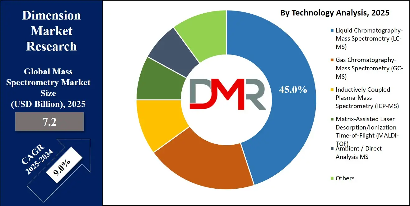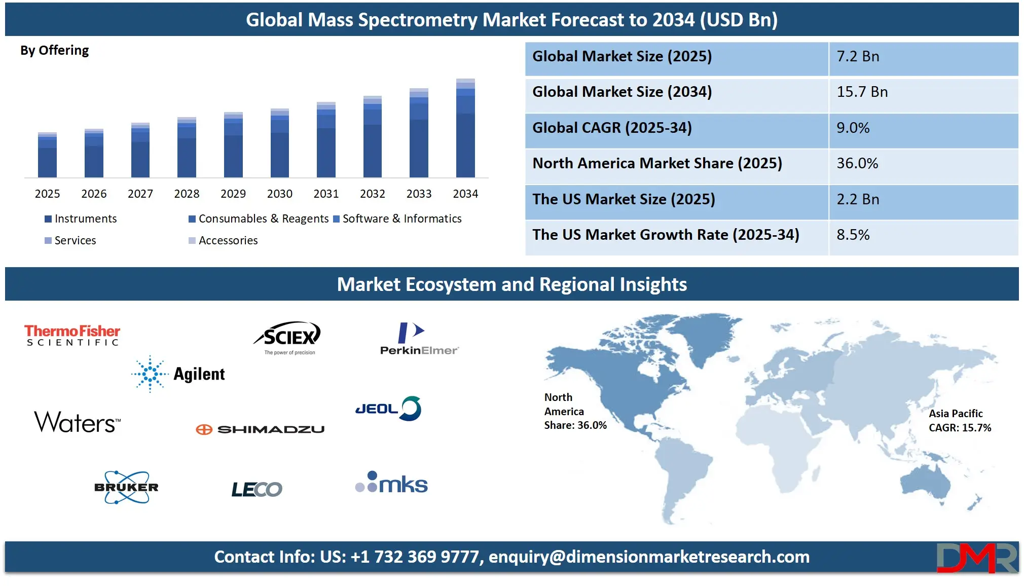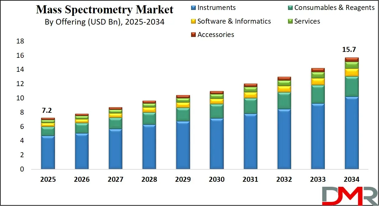 • Market Value: The global Mass Spectrometry market size is expected to reach a value of USD 15.7 billion by 2034 from a base value of USD 7.2 billion in 2025 at a CAGR of 9.0%.