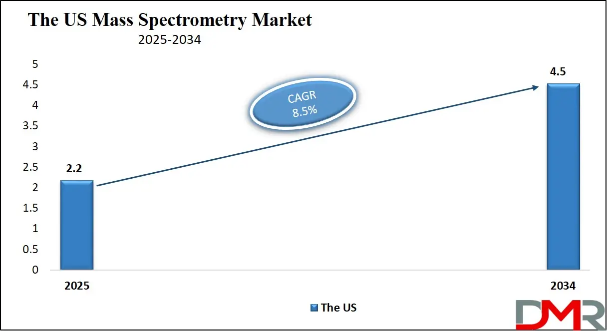 The US Mass Spectrometry Market is projected to be valued at USD 2.2 billion in 2025. It is expected to witness subsequent growth in the upcoming period as it holds USD 4.5 billion in 2034 at a CAGR of 8.5%.