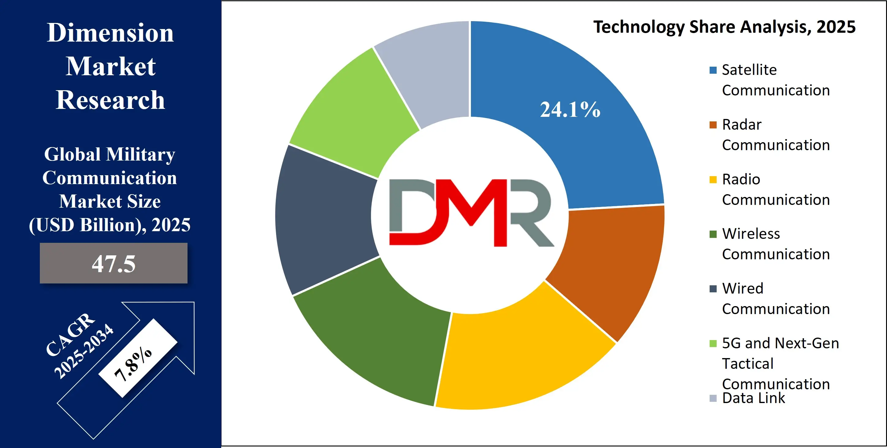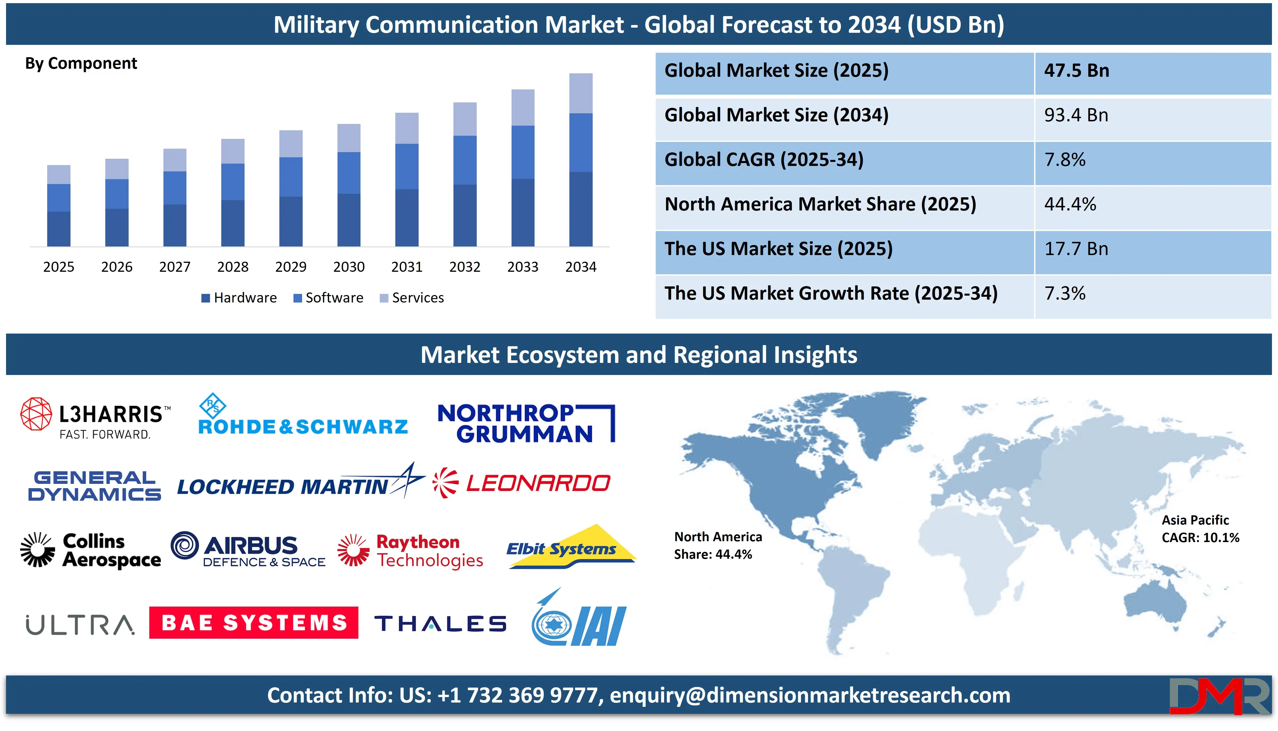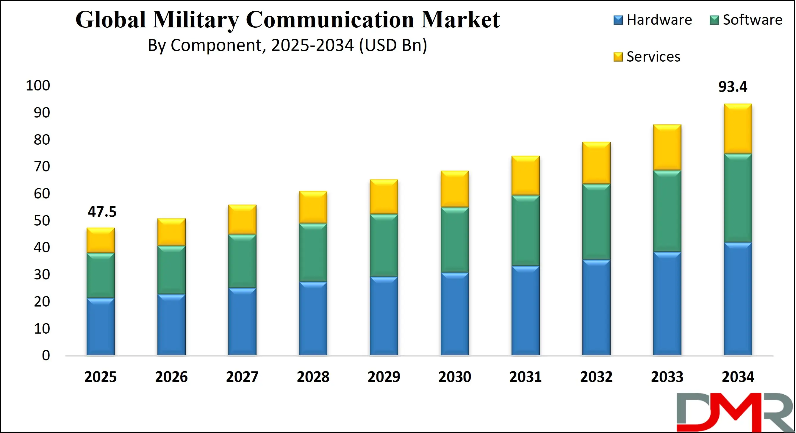 - Global Market Size Insights: The Global Military Communication Market size is estimated to have a value of USD 47.5 billion in 2025 and is expected to reach USD 93.4 billion by the end of 2034.