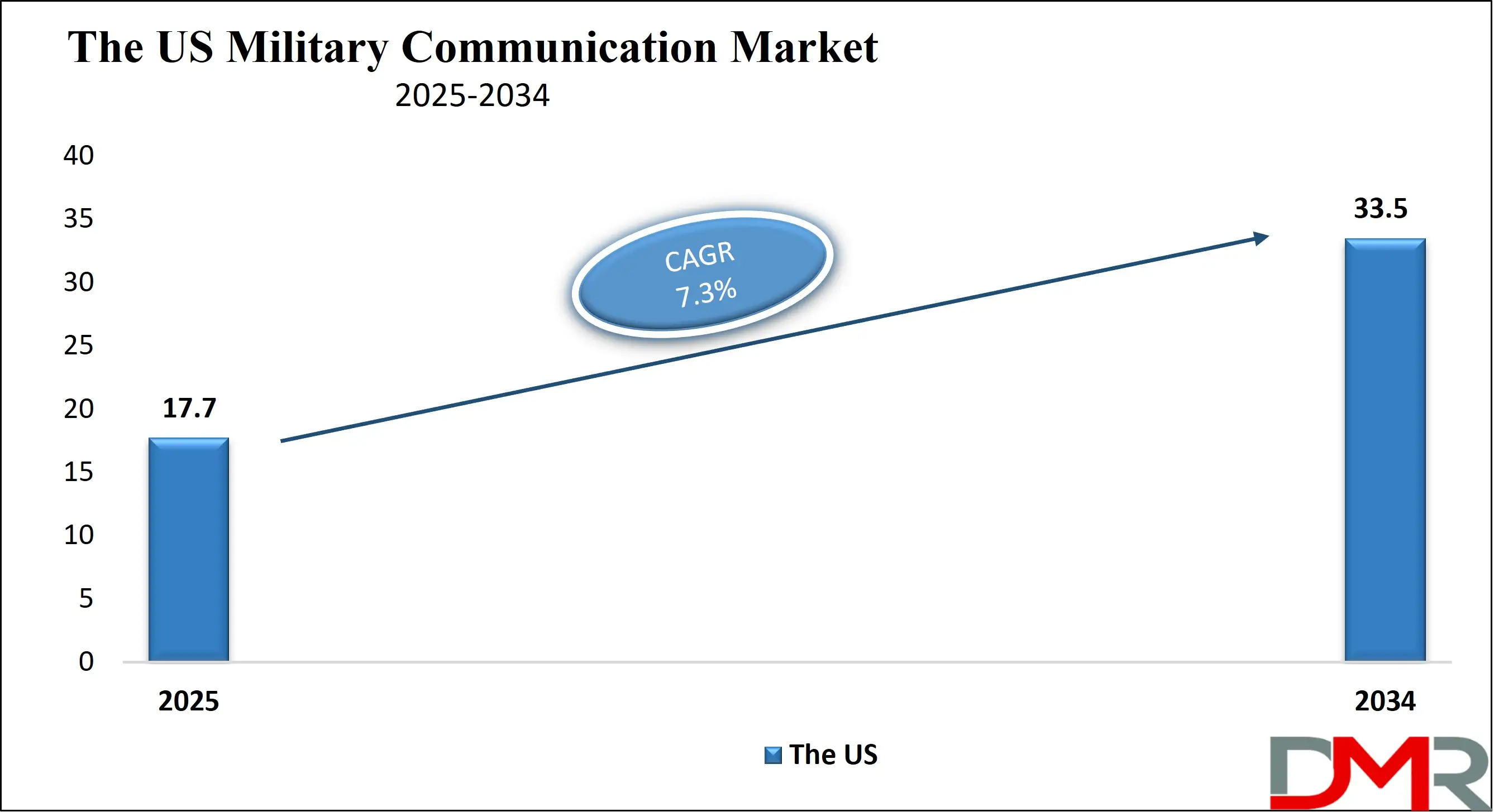 The US Military Communication Market is projected to be valued at USD 17.7 billion in 2025. It is expected to witness subsequent growth in the upcoming period as it holds USD 33.5 billion in 2034 at a CAGR of 7.3%.