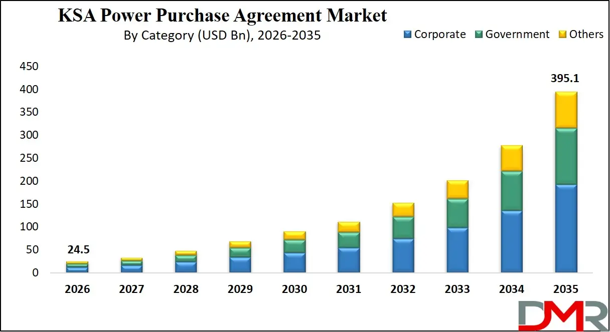 The KSA Power Purchase Agreement Market size is projected to reach USD 24.5 billion in 2026 and grow at a compound annual growth rate of 36.2% to reach a value of USD 395.1 billion in 2035.