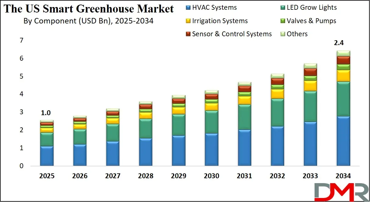 The US smart greenhouse market has witnessed significant growth due to rising demand for controlled-environment agriculture and the increasing adoption of advanced agricultural technologies. The market is driven by the need to produce high-quality crops year-round, particularly in urban and semi-urban regions where traditional farming faces space and climate constraints. Key components such as climate control systems, LED grow lights, irrigation technologies, and sensors are widely deployed to enhance automation and optimize plant growth conditions.