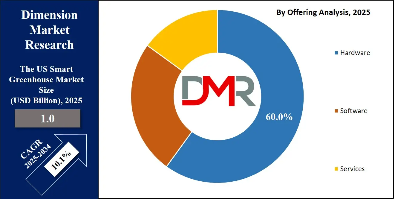 In the US smart greenhouse market, hardware is expected to maintain its leading position in the offering segment, accounting for approximately 60% of the total market share in 2025. Hardware components include climate control systems, LED grow lights, automated irrigation units, valves, pumps, and sensor networks, all of which are essential for creating optimal growth conditions in controlled-environment agriculture. These physical systems form the backbone of smart greenhouses, enabling precise regulation of temperature, humidity, light, and nutrient supply. The high adoption of advanced hardware is driven by commercial growers and research institutions seeking to maximize crop yield, improve resource efficiency, and implement automated farming practices.